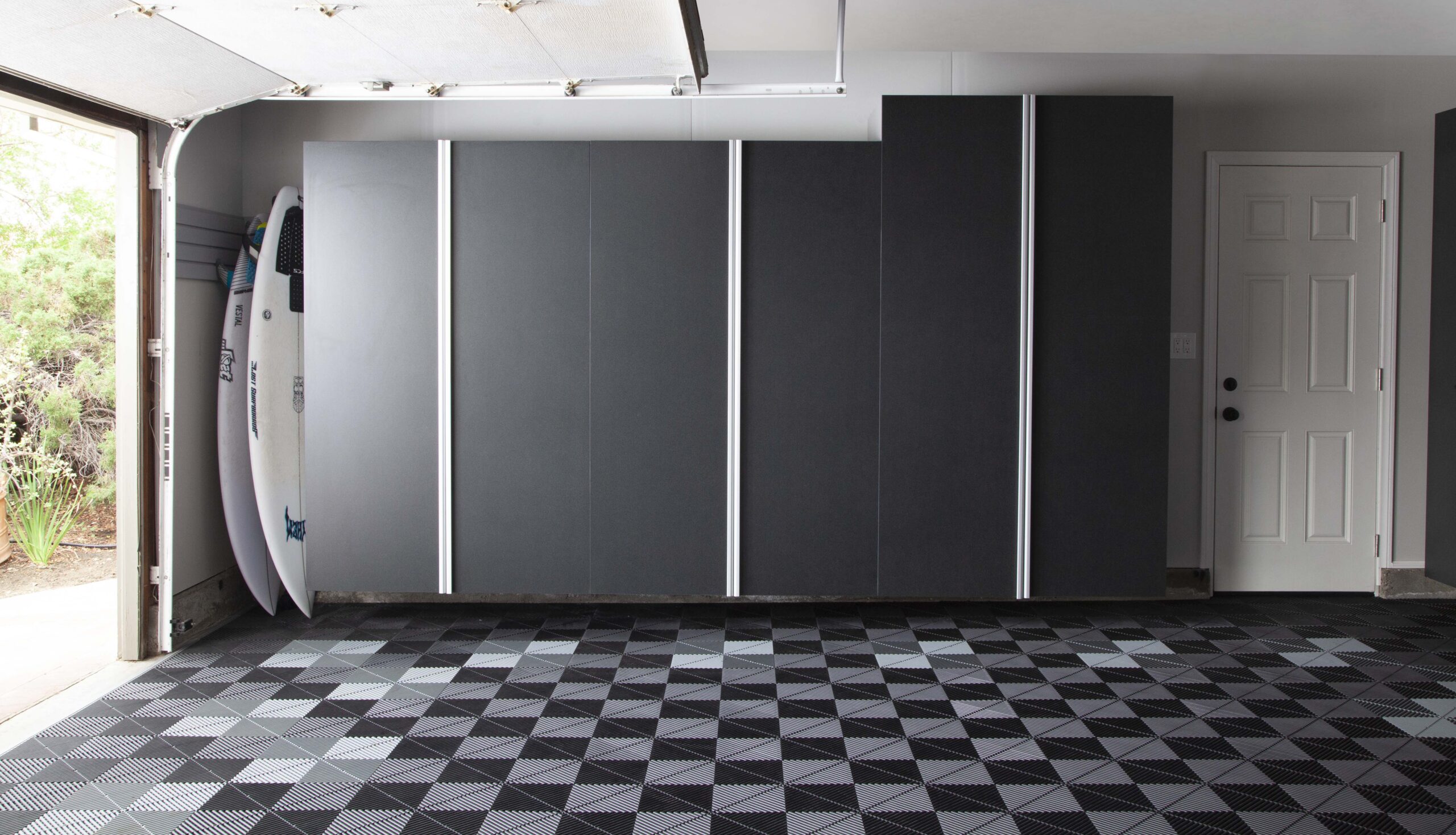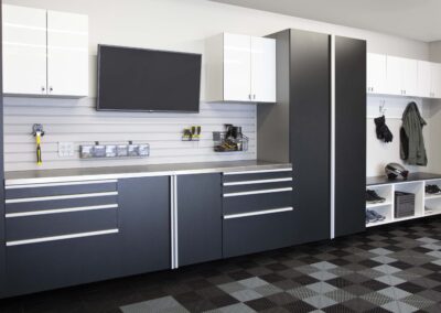 - Garage Custom Cabinetry – Our superior-grade cabinets with full backs bring luxury to your garage while providing the best protection for your stored items. Wall-mounted construction prevents water damage and makes cleaning your garage simple.