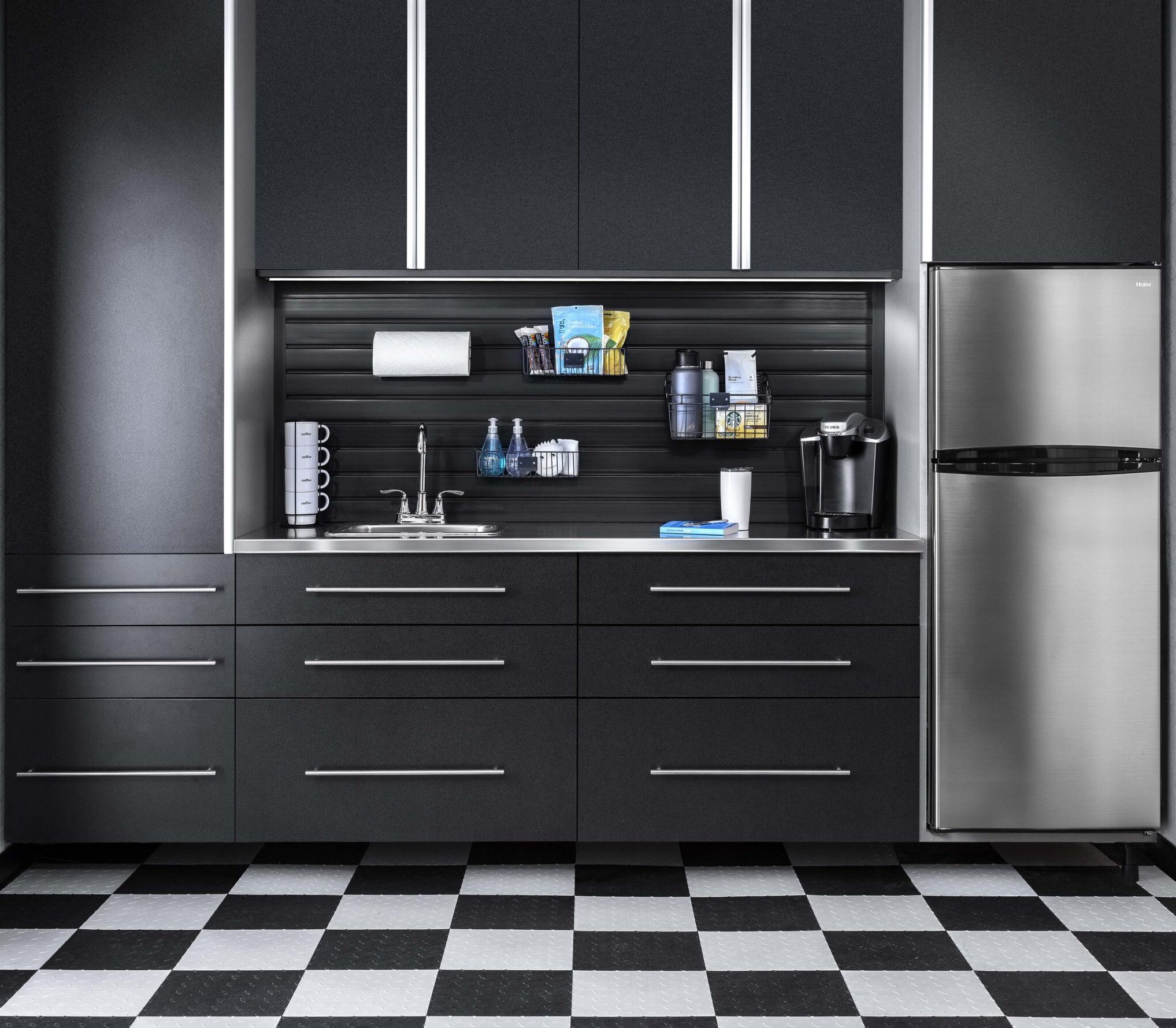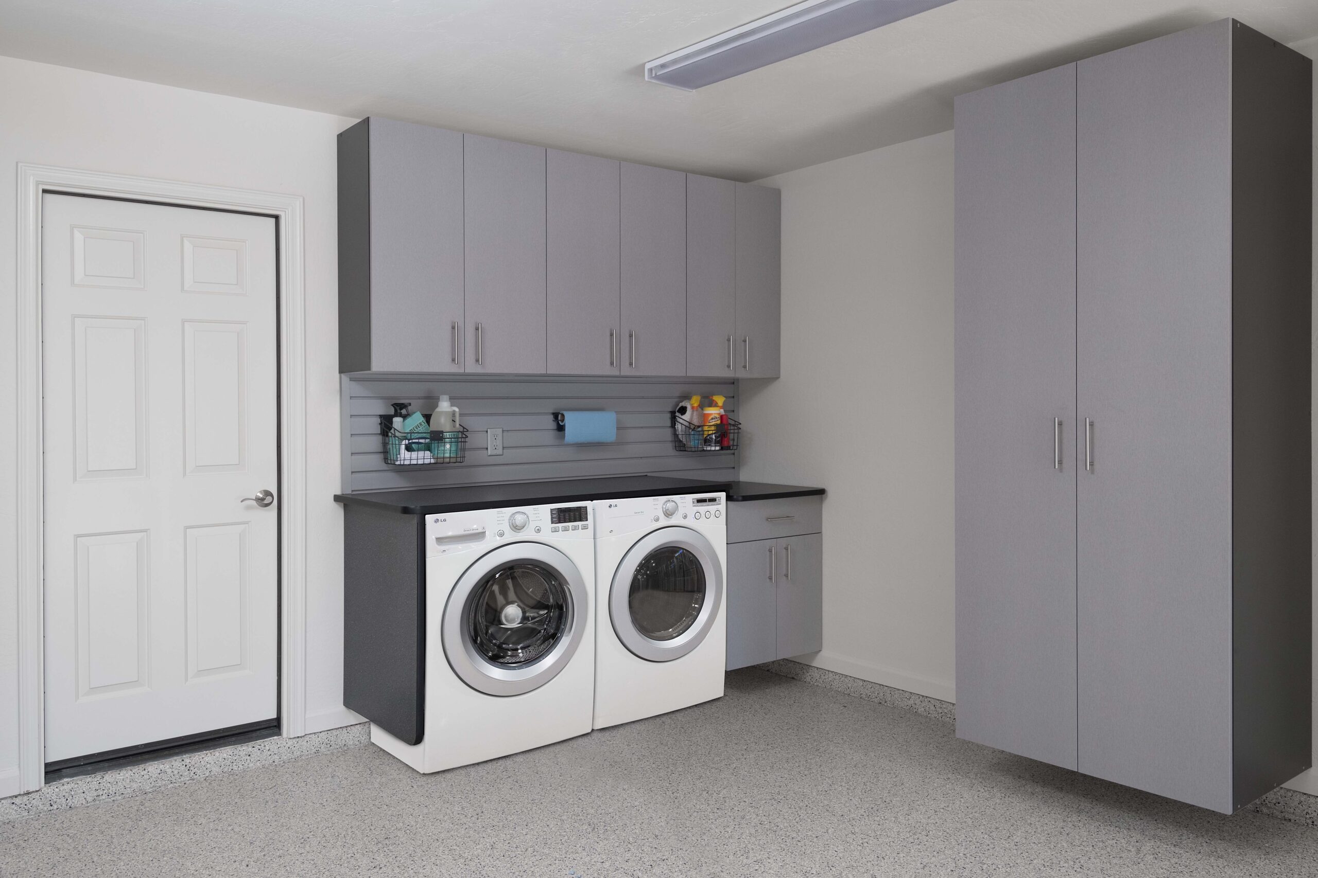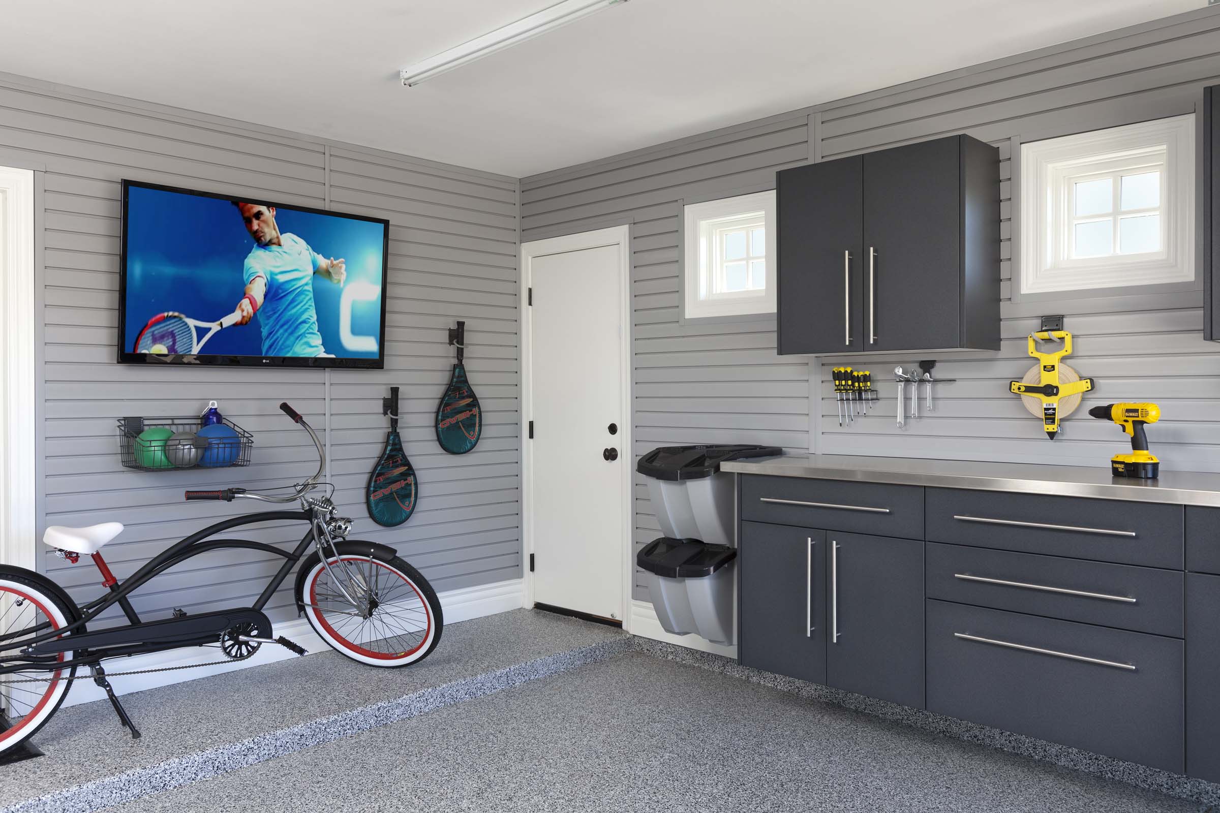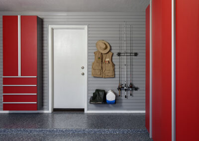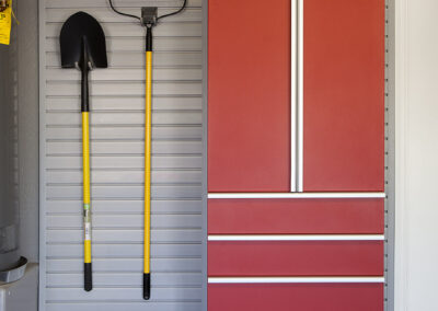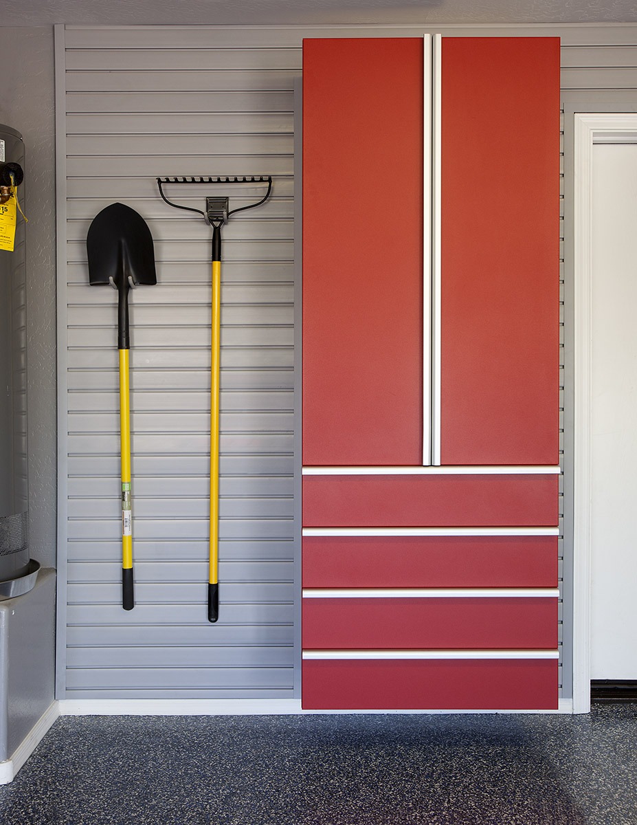 - Slatwall Storage Systems – Keep your garage organized and clutter-free with our wall-mounted slatwall systems from StoreWALL. Moveable hooks, baskets, and specialized racks provide easy access to everyday items. Stationary and/or motorized overhead racks are also available for storing bulky seasonal items.